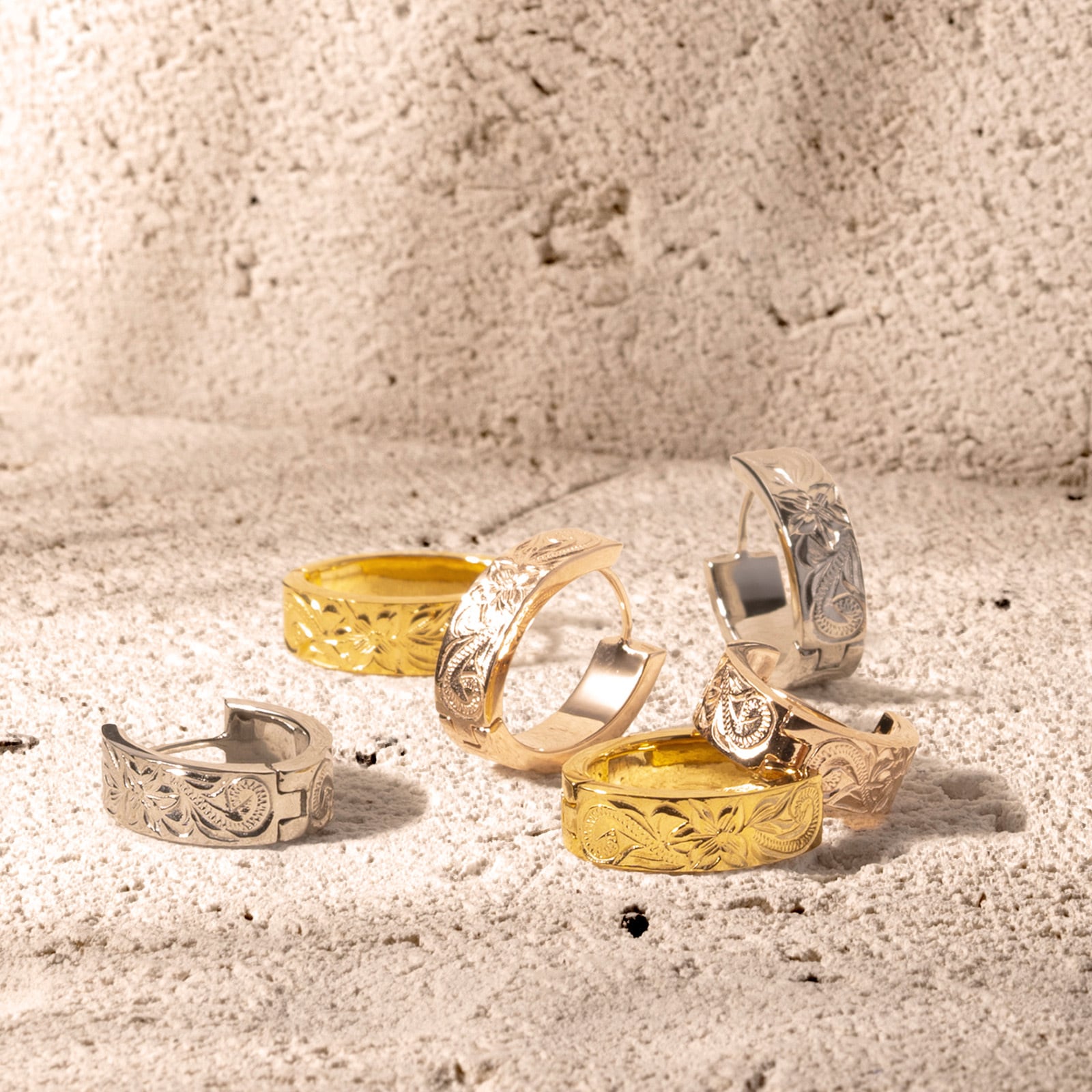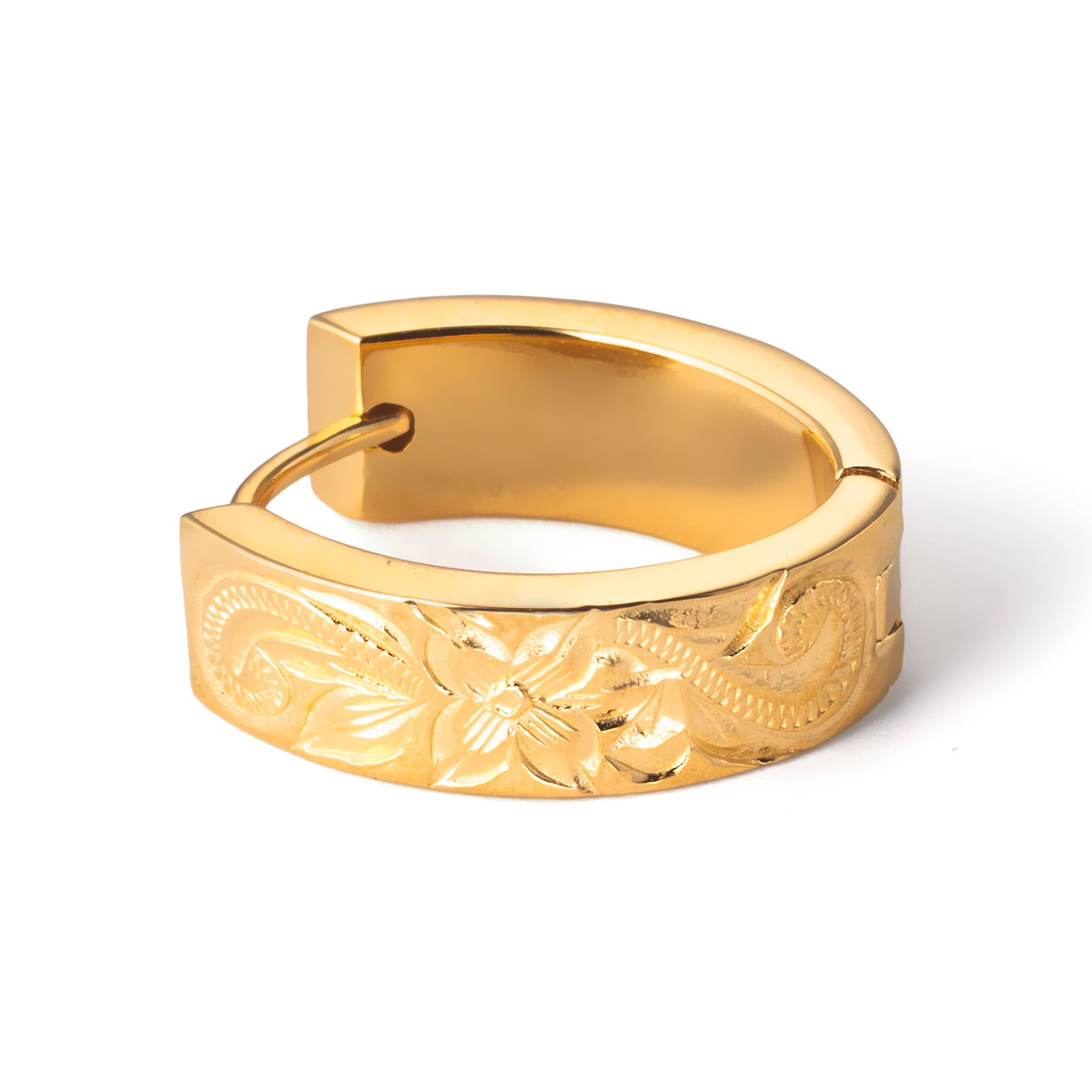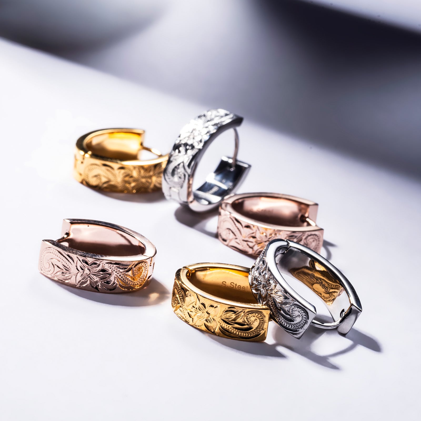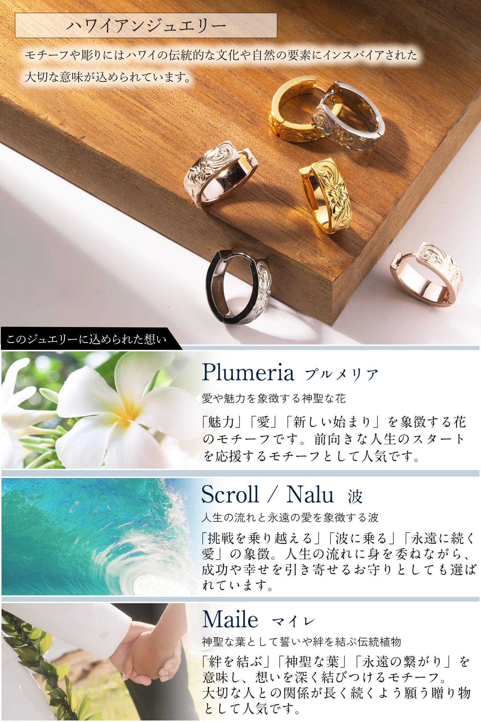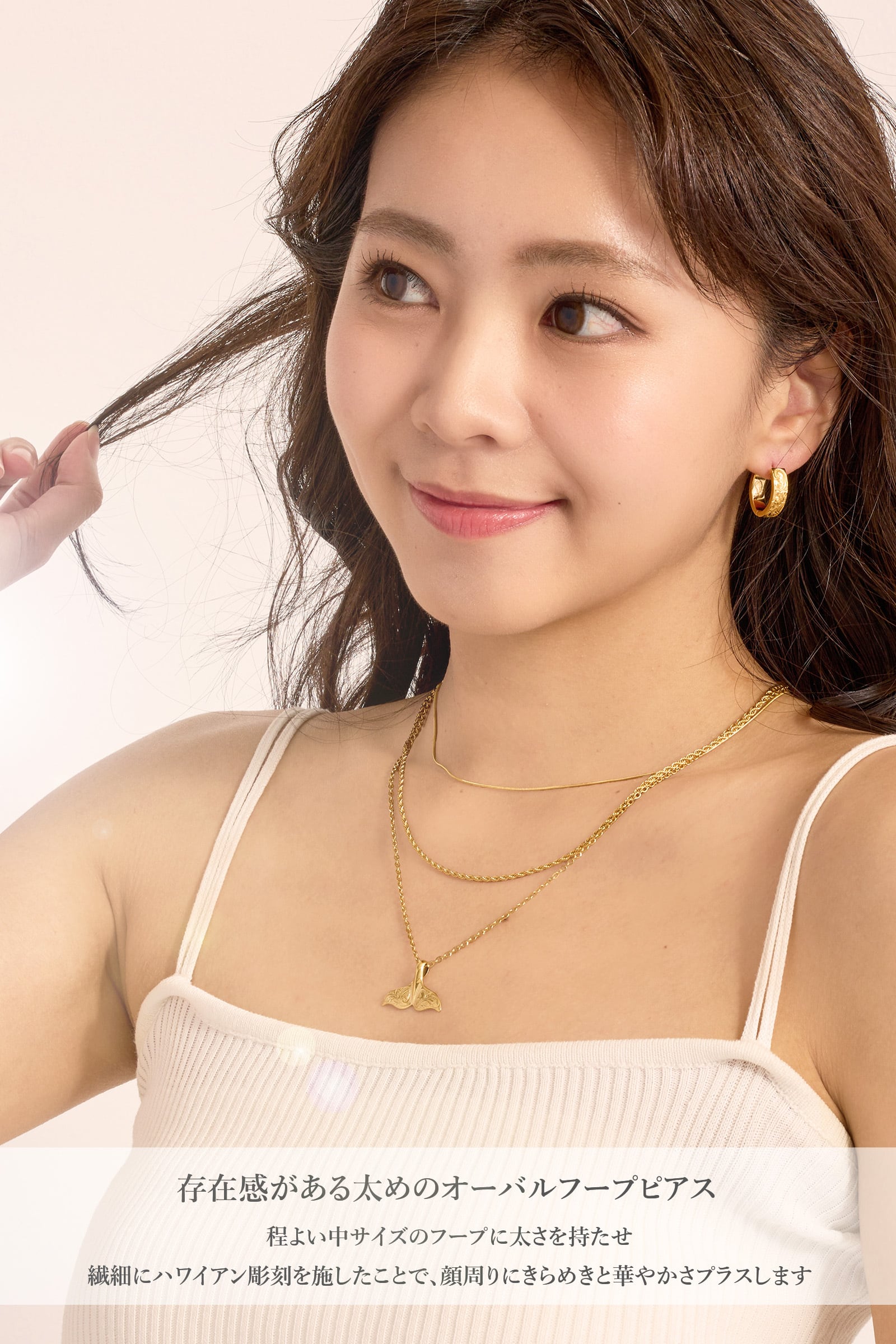 程よい中サイズのフープに太さを持たせ繊細にハワイアン彫刻を施したことで、きらめきと華やかさを演出