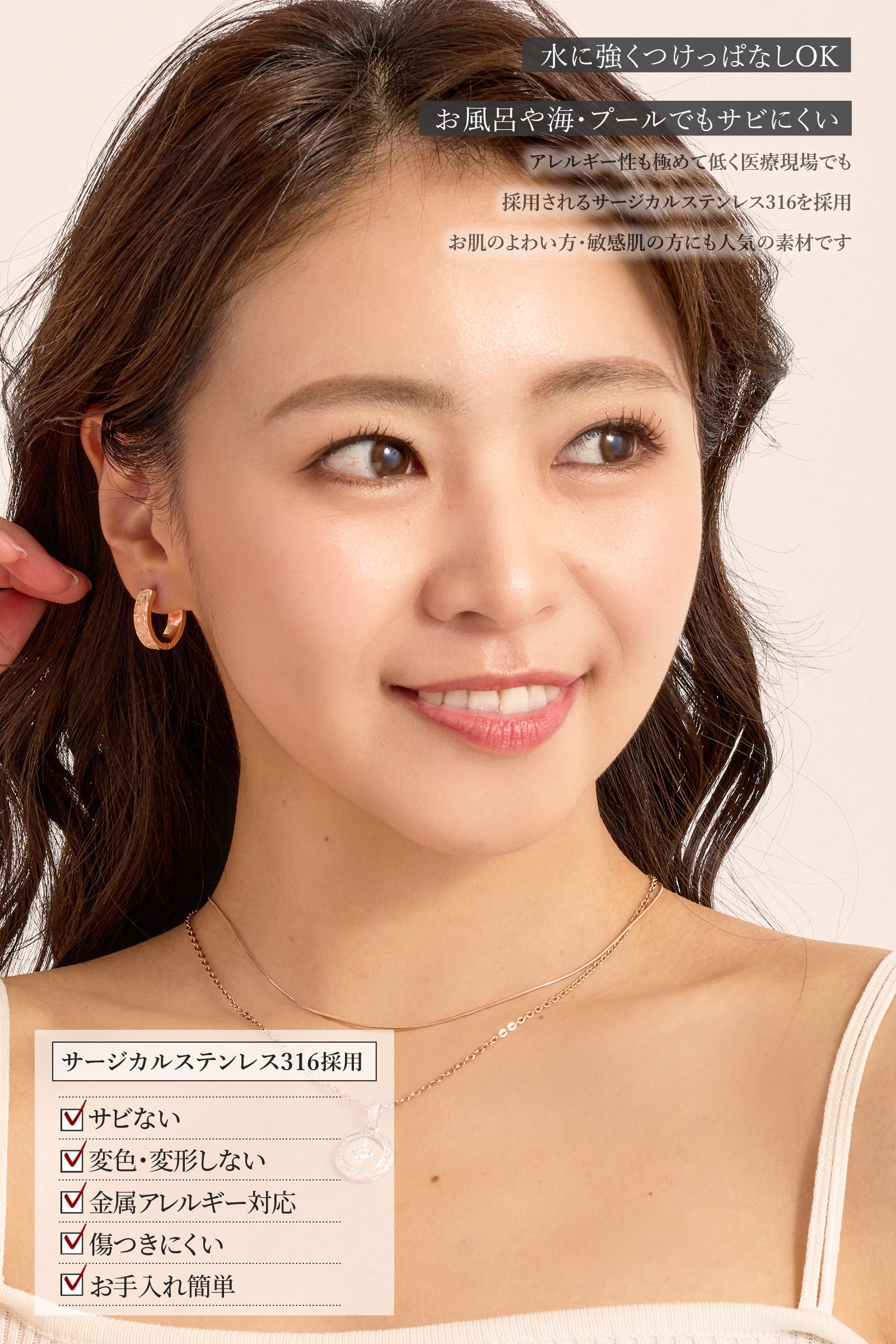 耐食性が非常に高く、水や汗によるサビ・変色に強い素材です。お風呂や海でも気にせず着けたままご使用いただけます。