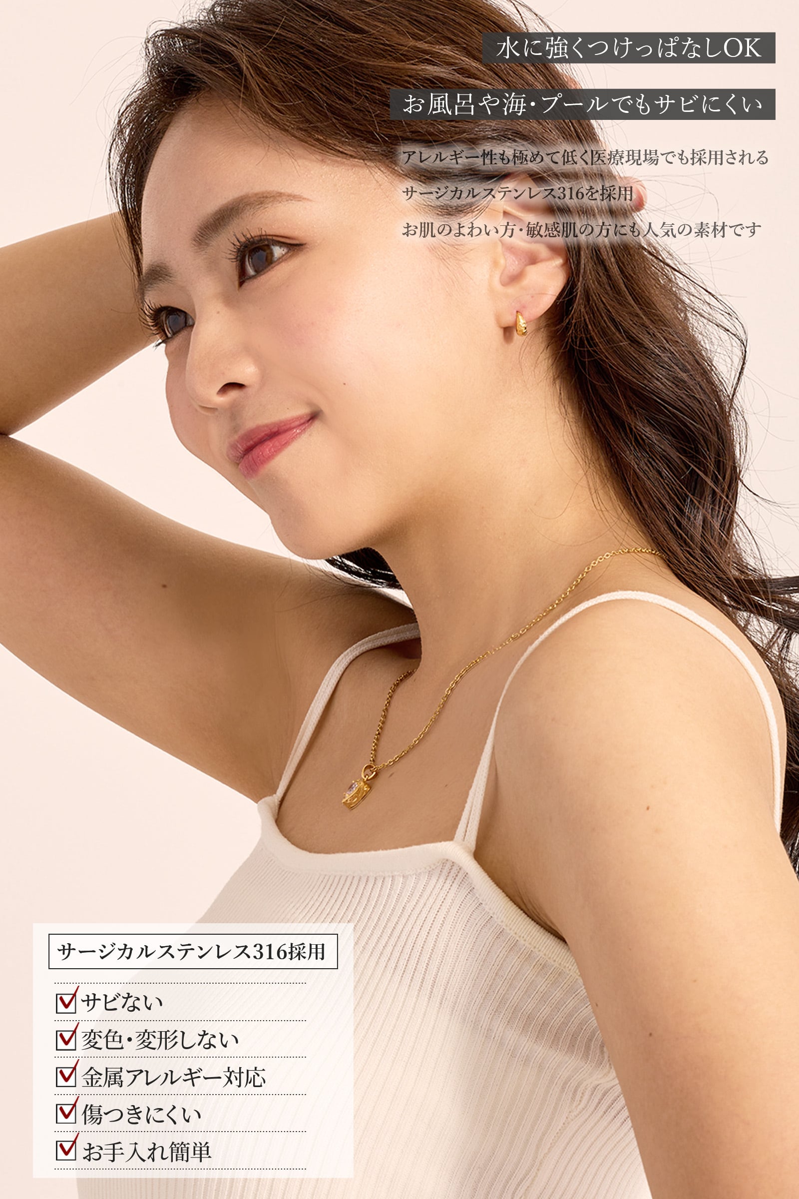 【お風呂、海つけっぱなしOK】 耐食性がとても高いので水や汗によるサビ、変色に強いのでお風呂や海へ気にせずアクセサリーを着けたまま入ることができます。