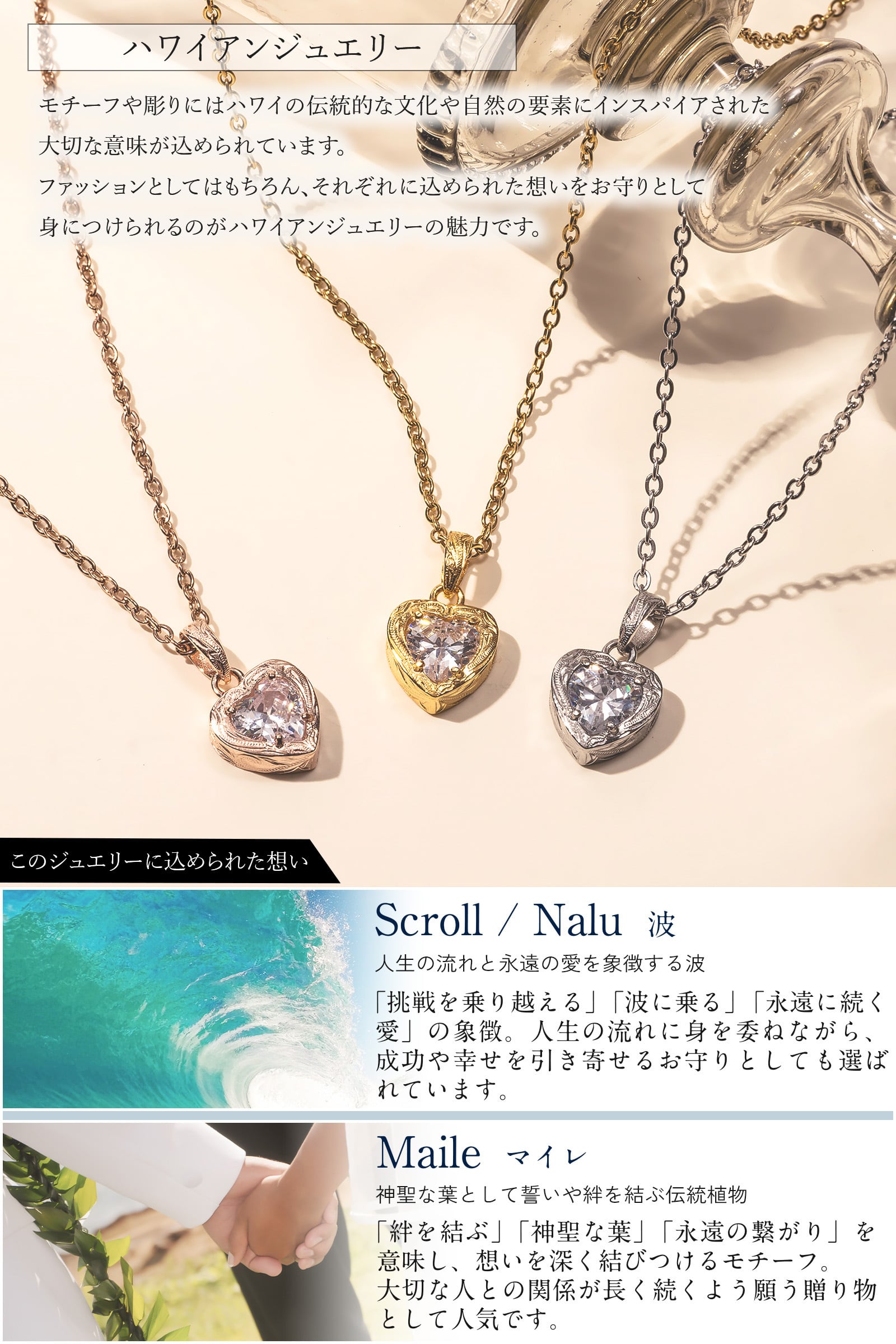 ハワイで波は『幸せを運んでくる』と考えられており、途切れることなく打ち寄せることから、「永遠の愛」「途切れることのない幸せ」何度もチャレンジして乗り越える、波に乗って「成功する力」を与えるといわれていて成功のお守りや恋人とのペアジュエリーとしても人気が高いデザインです。