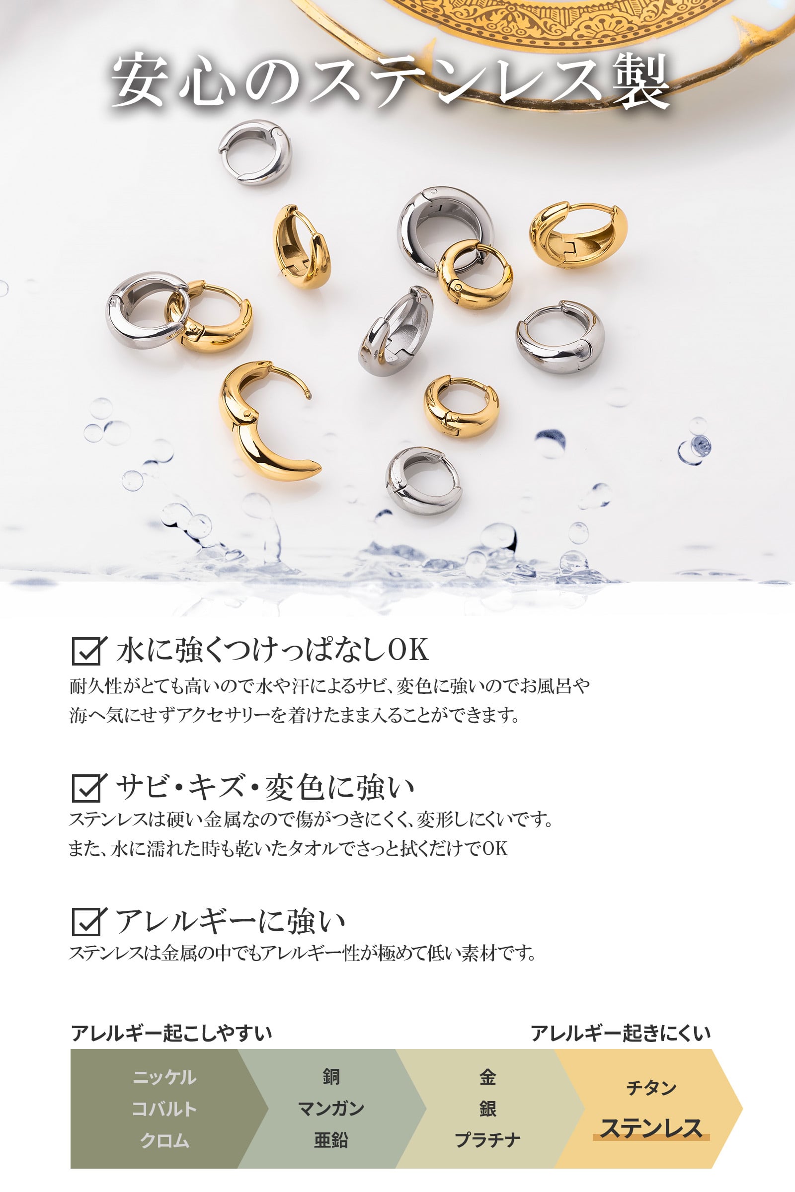 ステンレスは耐食性がとても高いので水や汗によるサビ、変色に強いのでお風呂や夏の海、ビーチ、プール でもお洒落を楽しめます。