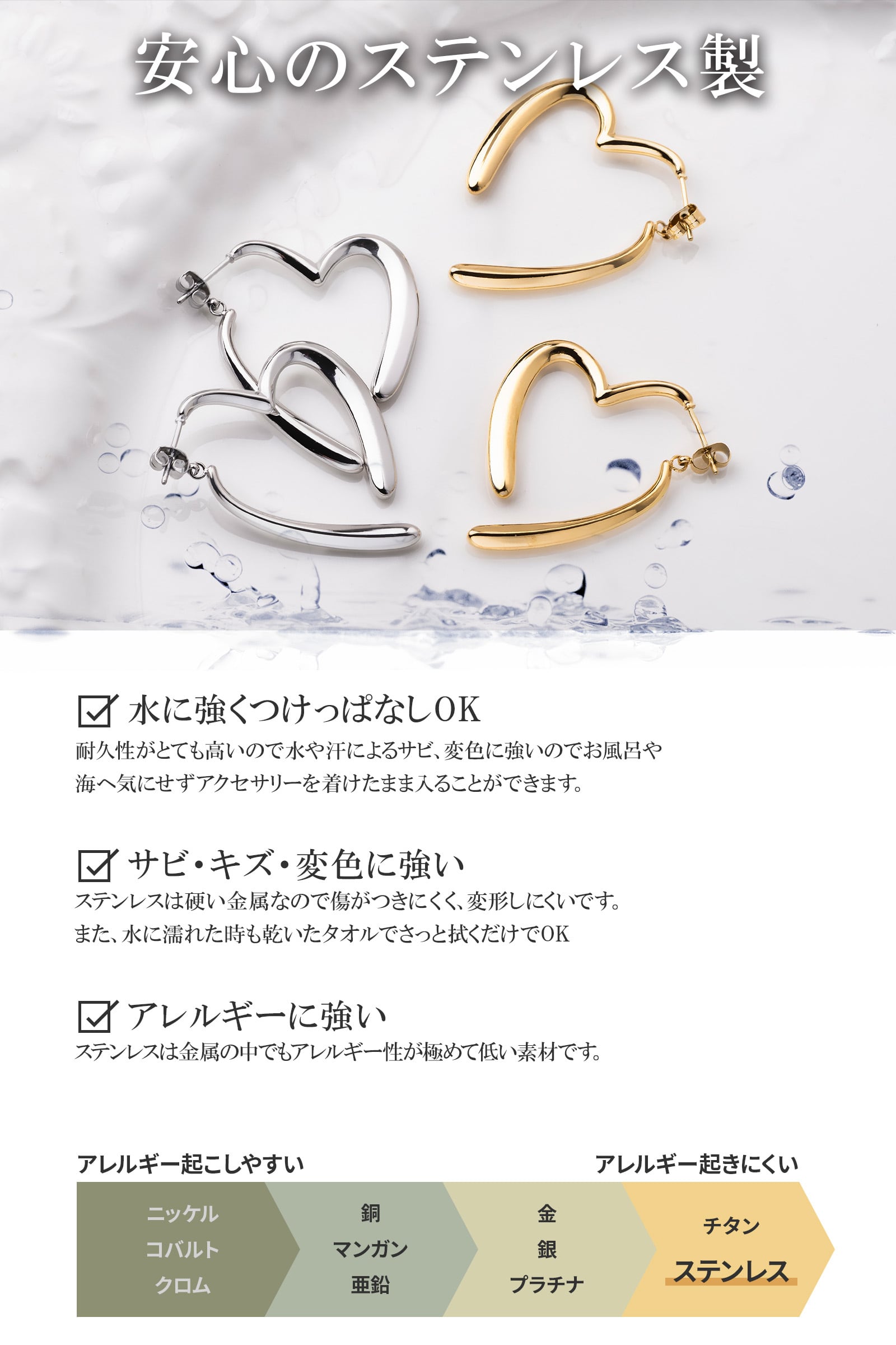 ステンレスは金属の中でもアレルギー性が極めて低い素材です。