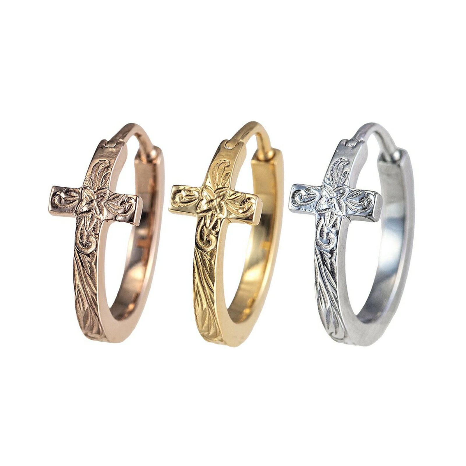 精巧なスクロール(波ぶり)模様が施されたハワイアンジュエリーのフープピアスと十字架が融合したトレンドのデザインです。