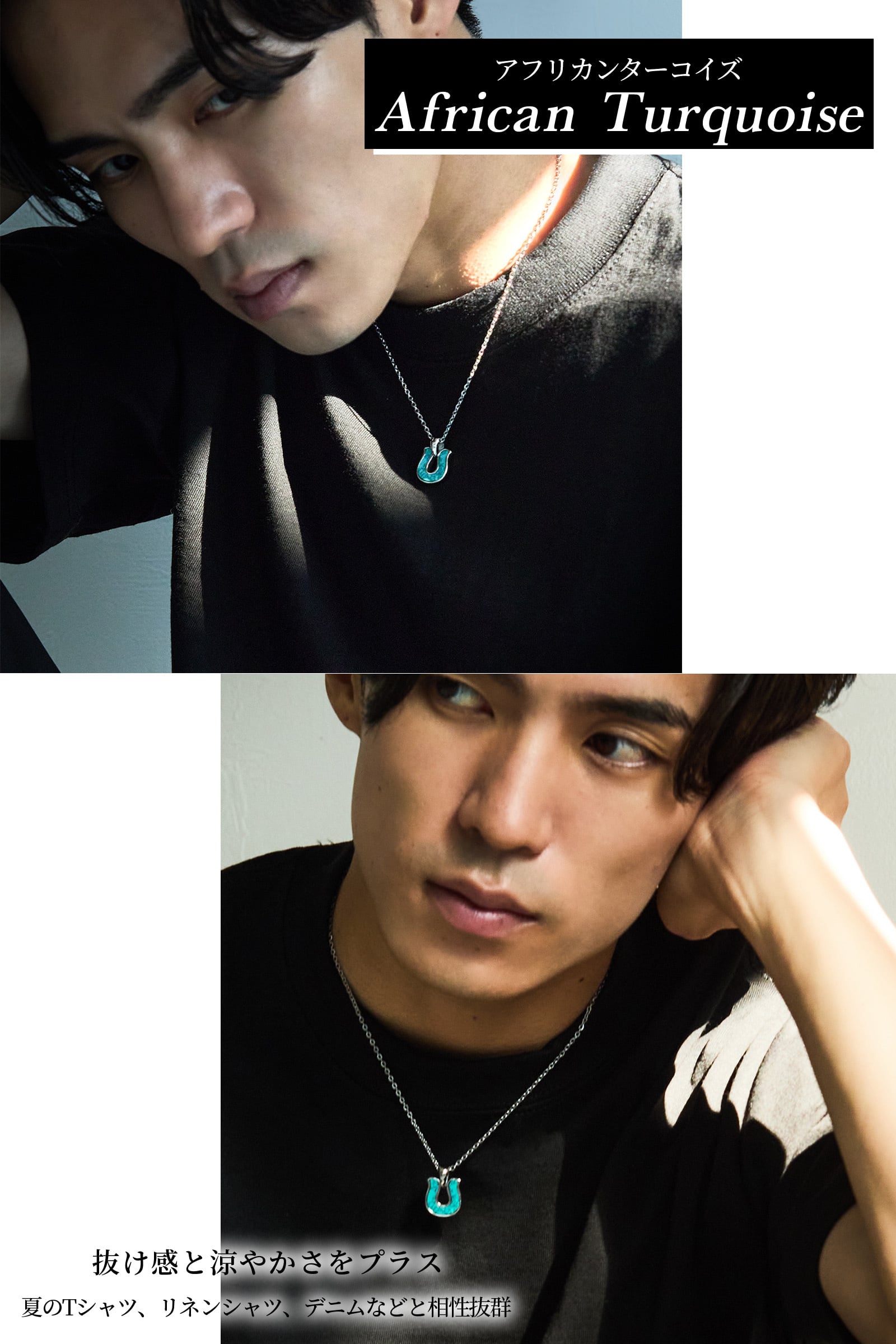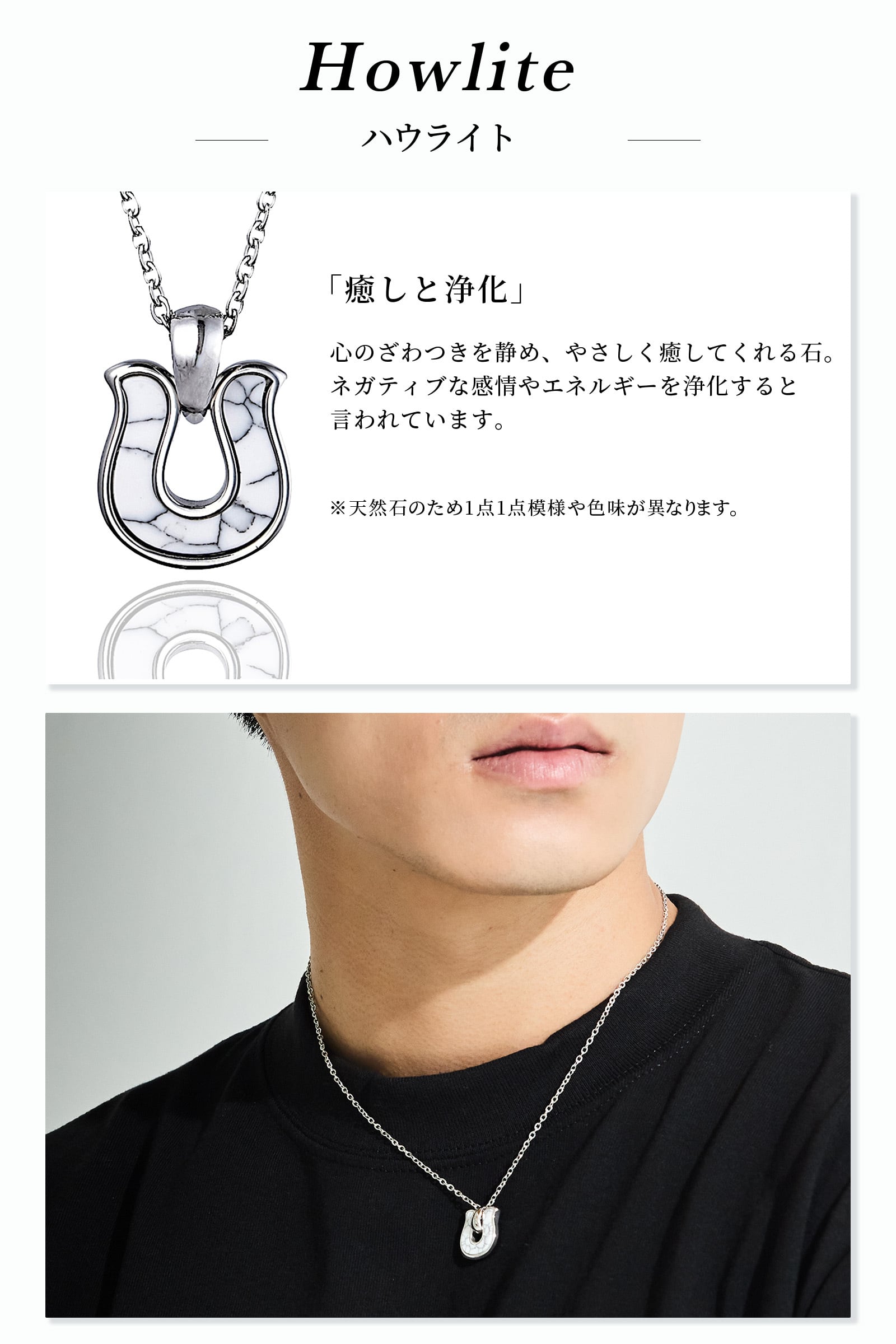 ホースシュー型の中にターコイズを埋め込んだペンダント。模様がランダムに配置されているのでそれぞれに個性があるデザイン性。チャームが小ぶりなのでシーンを選ばず着用があ可能です。