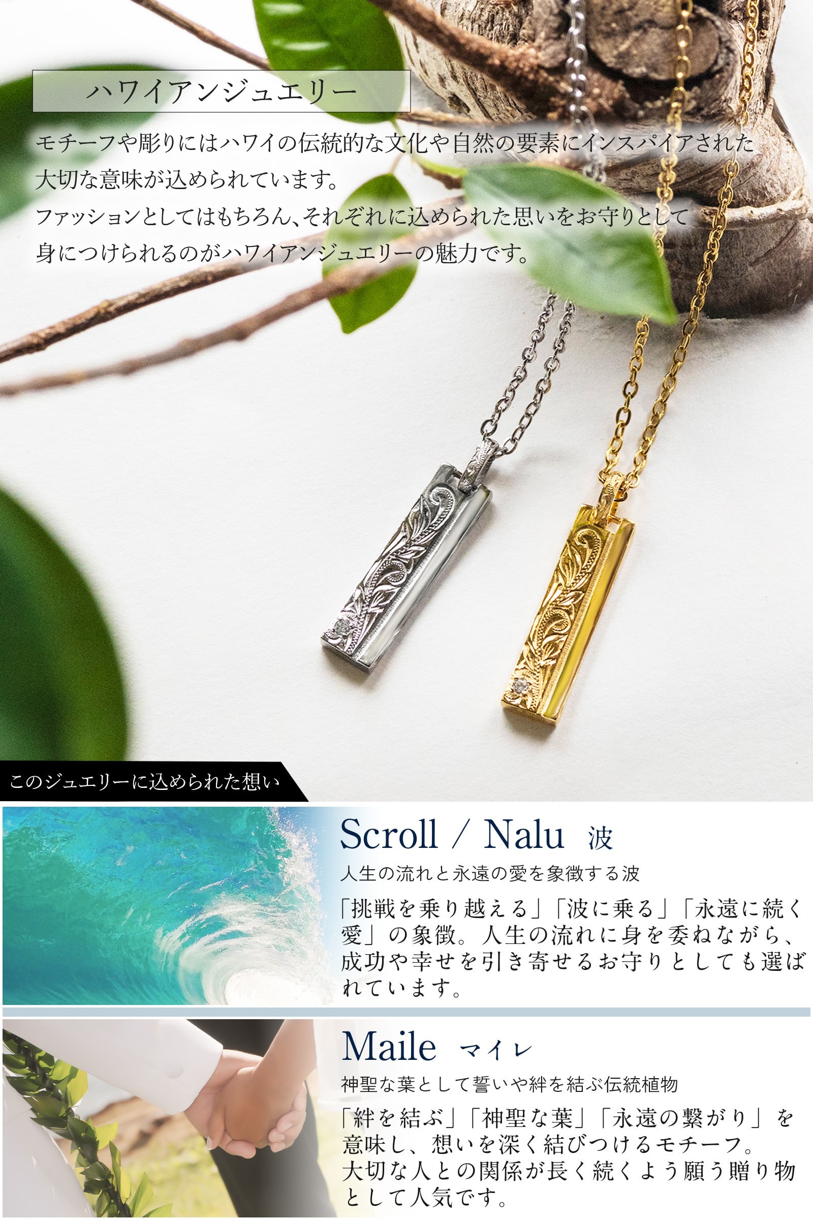 スクロール(波)をモチーフにした人気が高いハワイアンジュエリーです。ハワイではスクロール(波)は「幸運」「永遠の愛」「成功」「困難を乗り越える」という意味が込められており、プレゼントやお守りとしてもおすすめのネックレスです。