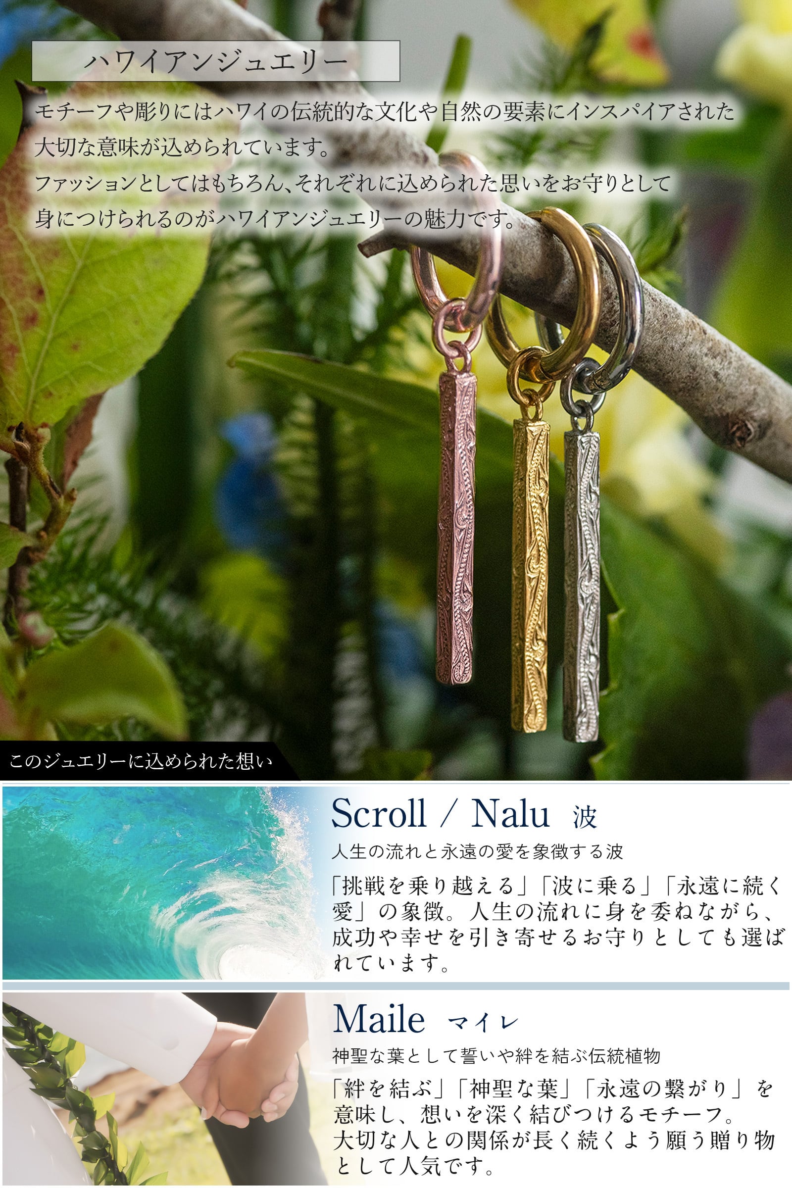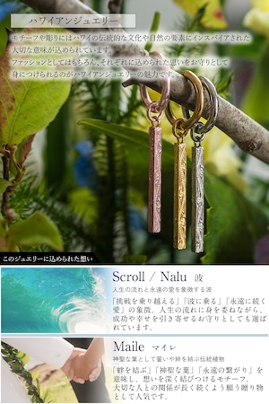 スクロール(波)をモチーフにした人気が高いハワイアンジュエリーです。ハワイではスクロール(波)は「幸運」「永遠の愛」「成功」「困難を乗り越える」という意味が込められており、プレゼントやお守りとしてもおすすめのピアスです。